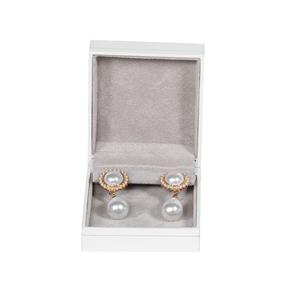 The box features a sturdy plastic core wrapped in high-quality paper. The interior is lined with soft velvet fabric to protect earrings from scratches. The black box is printed with gold decorative patterns on four sides, while the white box is printed with silver decorative patterns. The back side of each box is left plain. Available in classic white and black.