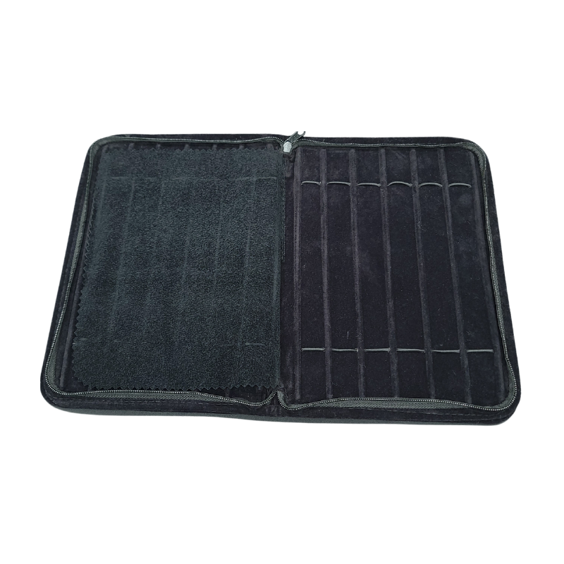 Crafted from premium velvet, this jewellery zip pouch offers a luxurious texture while protecting your bracelets from scratches. The interior is thoughtfully designed with 12 individual slots, each secured with elastic bands to hold bracelets securely. Available in black and grey, the pouch is both durable and stylish.