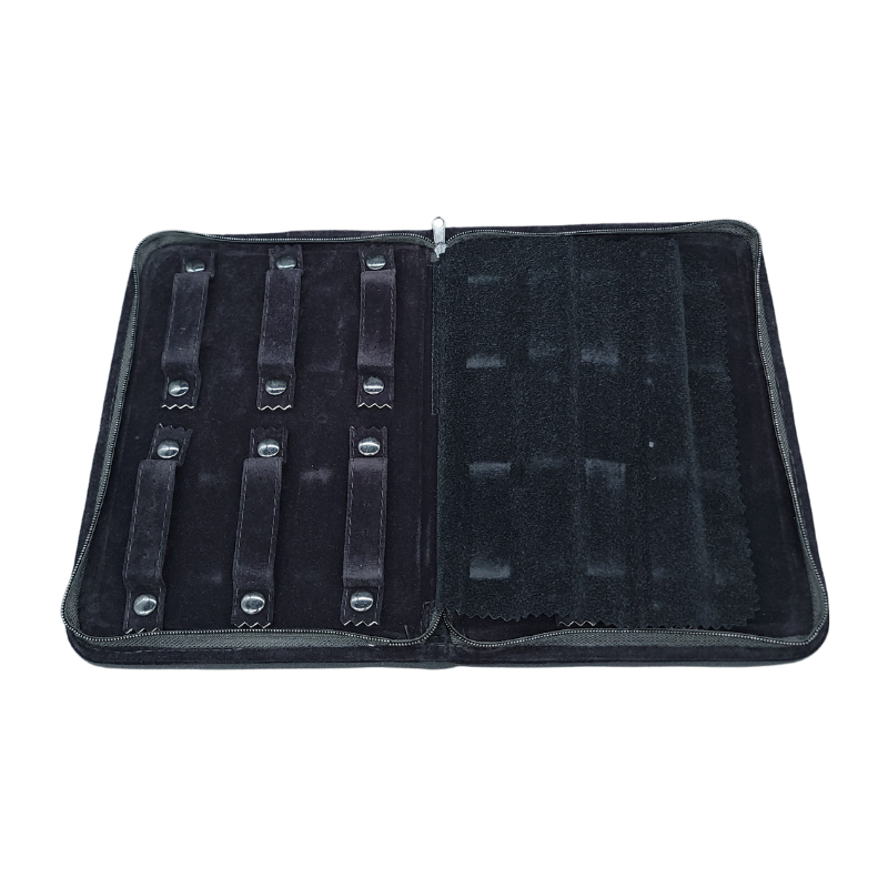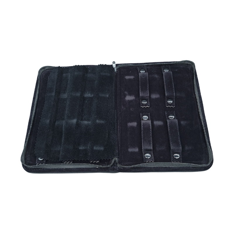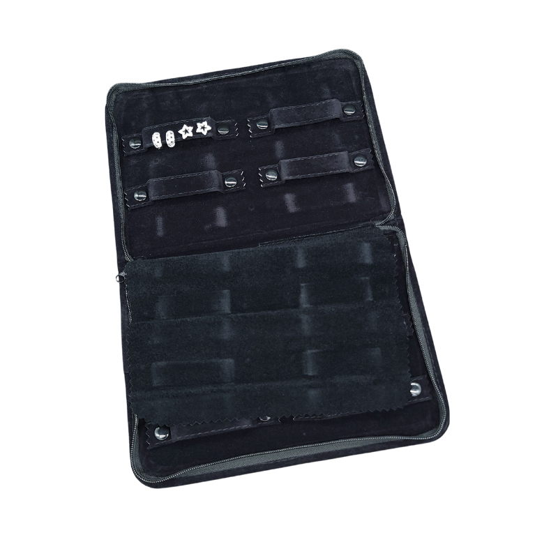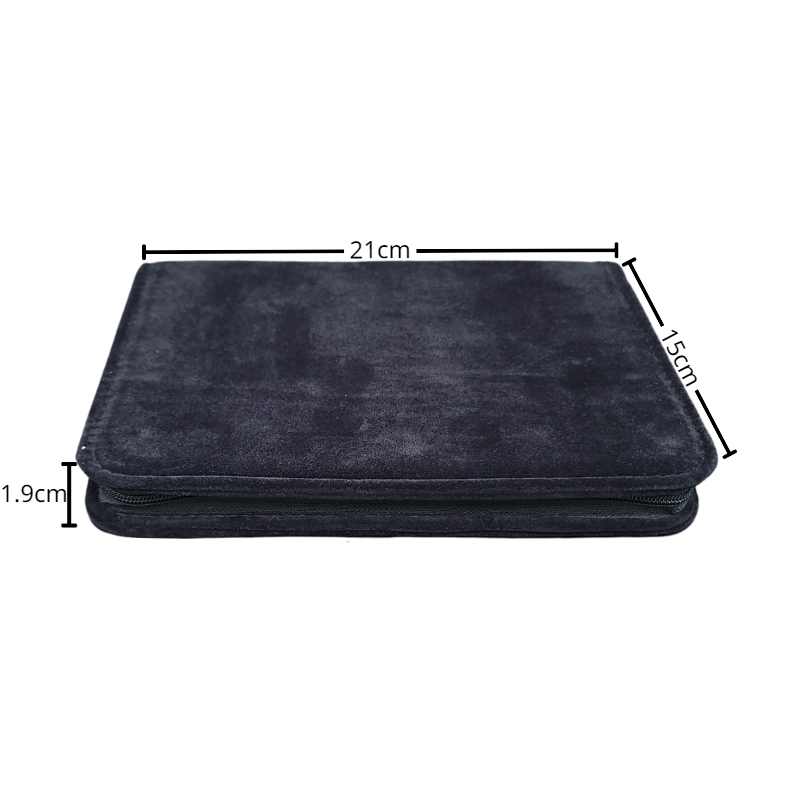 This pouch is made from premium soft velvet, offering a gentle yet durable surface to protect your earrings from scratches. The interior design features 10 secure earring straps, each equipped with metal snaps on both ends, ensuring earrings stay in place during storage or travel. The slim design enhances portability, while the black and grey colour options make it suitable for both personal use and professional presentations. This design accommodates various earring styles, providing versatility and functionality in one compact pouch.
