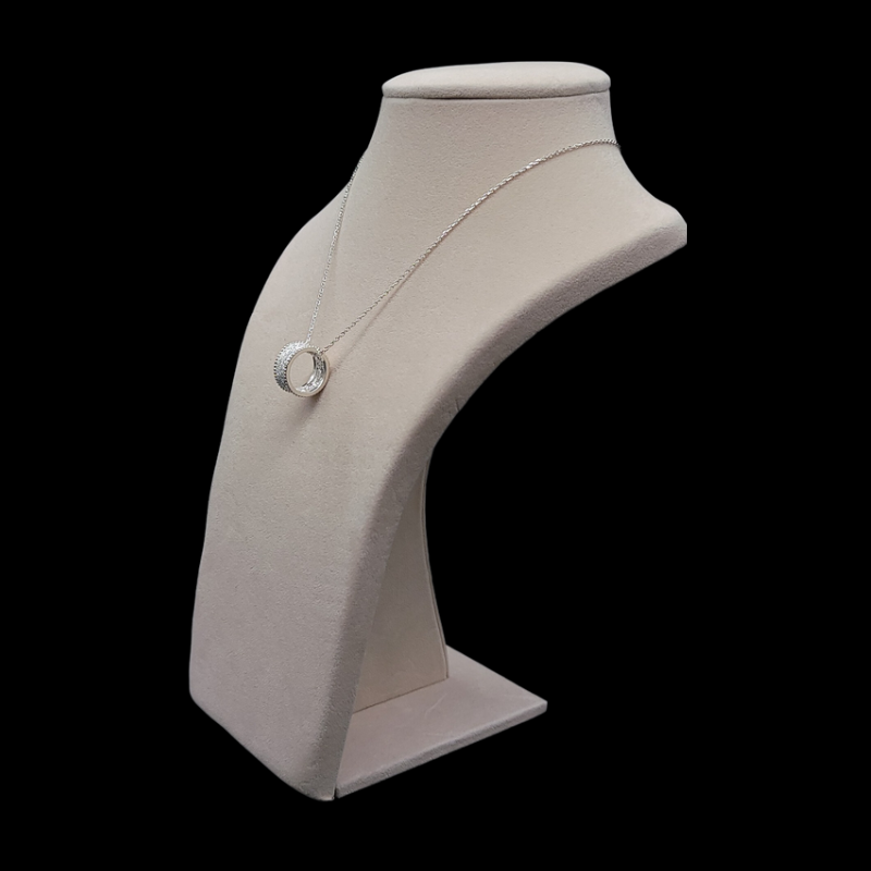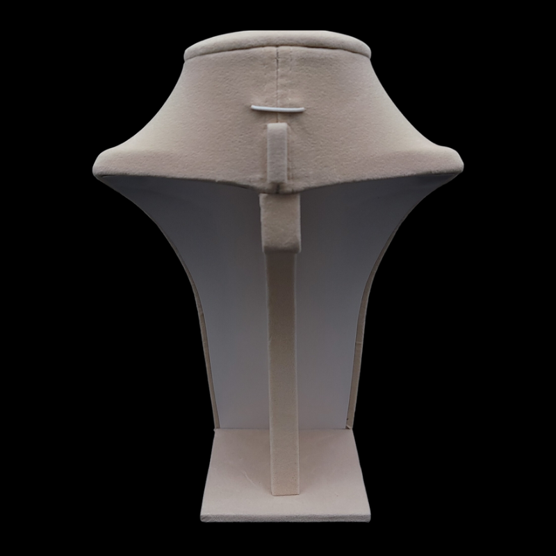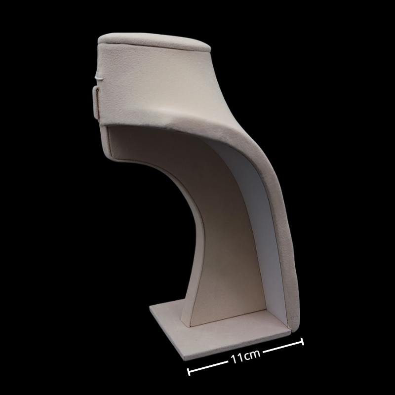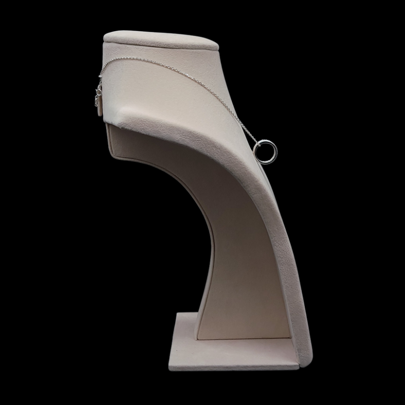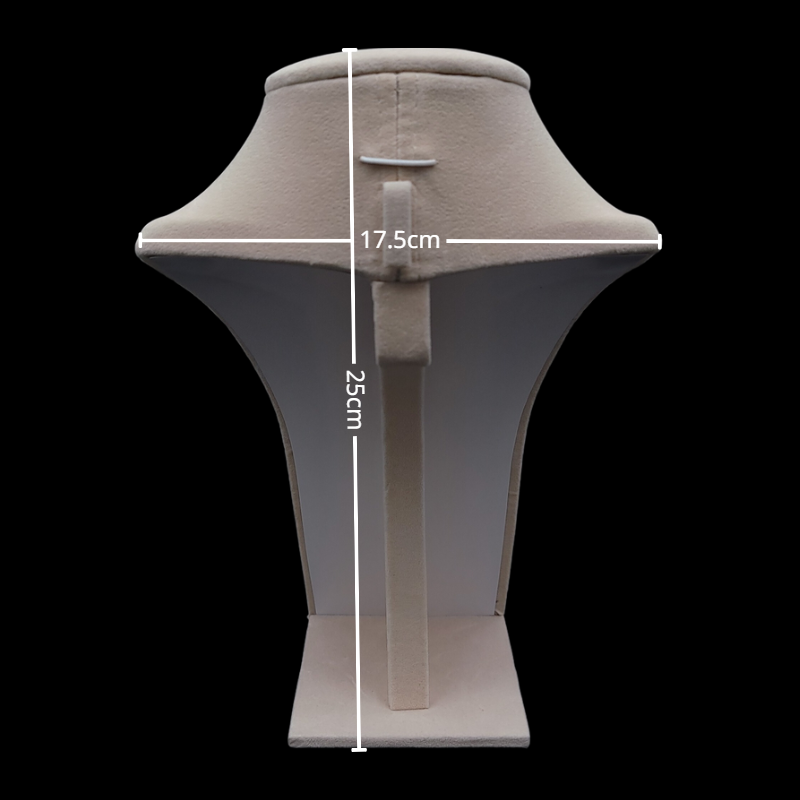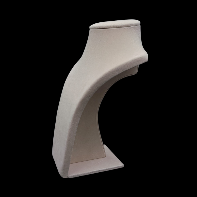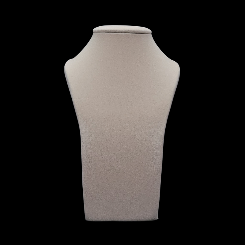 These jewelry necklace stands are crafted with two premium material options. The white stands are made from smooth leatherette, offering a clean, modern appearance ideal for minimalist displays. In contrast, the black and other colors are made from soft velvet, providing a plush and elegant texture that enhances the luxurious look of displayed jewellery. Featuring a bust-shaped profile, the stands are designed to hold necklaces securely in an upright position, showcasing their natural drape. The sturdy construction ensures stability, while the sleek, vertical structure makes them particularly suitable for displaying longer or layered necklaces. Available in three sizes, they cater to a variety of necklace styles and lengths, adding versatility to any retail, exhibition, or personal jewellery collection.