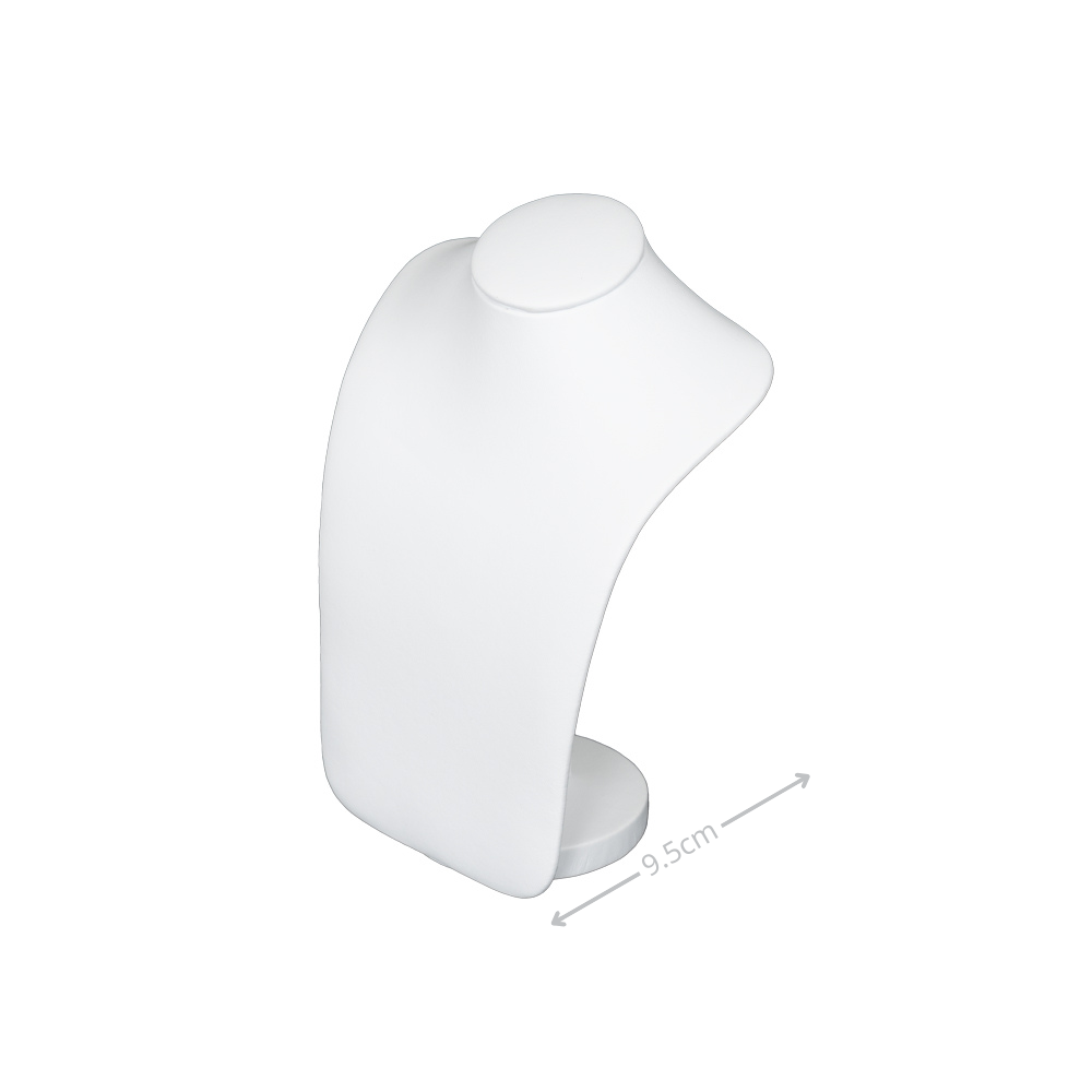 This necklace on display stand features a refined and sleek design, crafted from smooth leatherette. It is available in three sizes and comes in white, black, and beige (L size) options. The classic bust shape provides a sturdy base and optimally showcases necklaces of various styles, whether delicate or bold. Its slightly elongated design offers a unique silhouette compared to traditional necklace busts, making it ideal for retail displays, exhibitions, and personal collections.